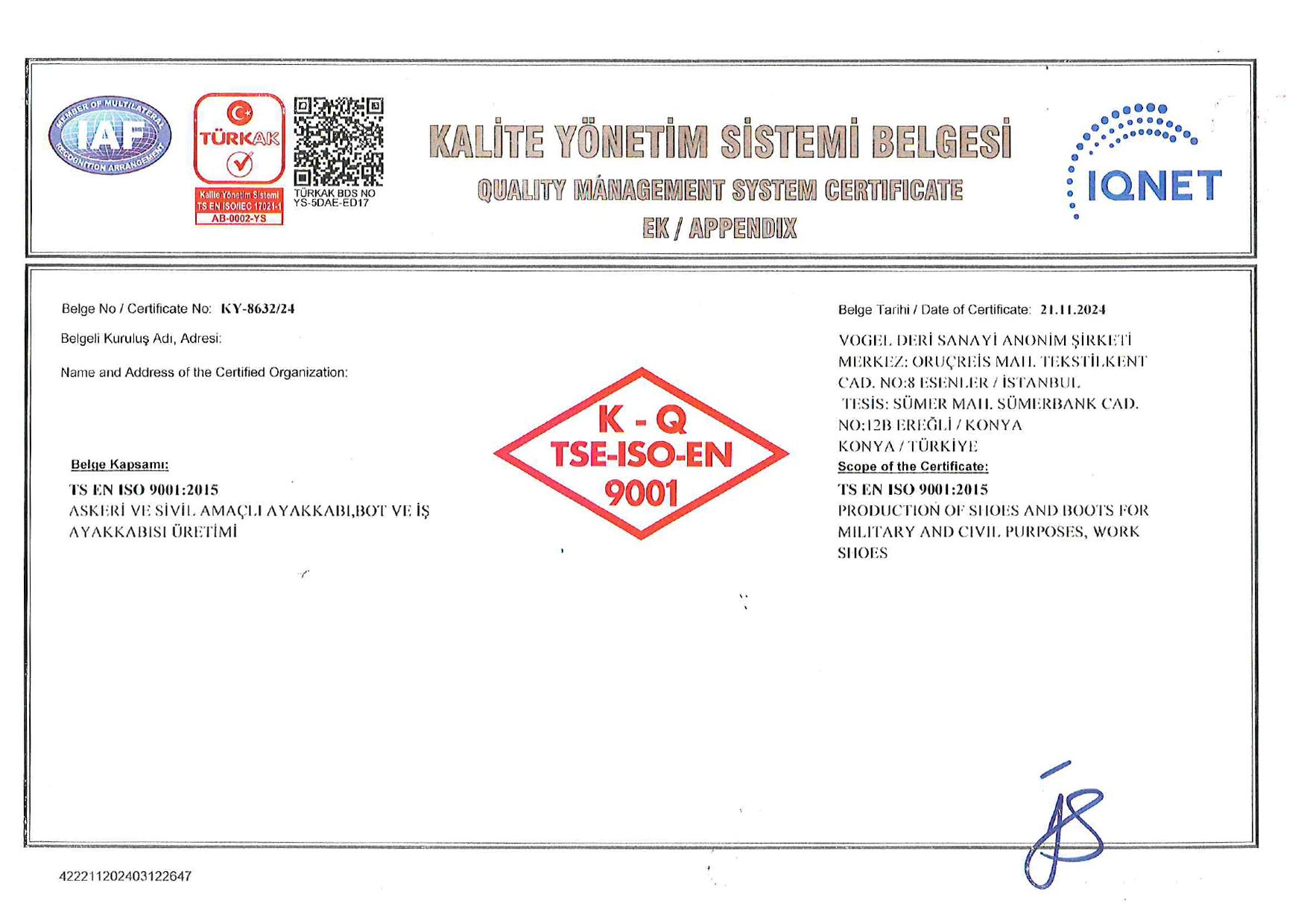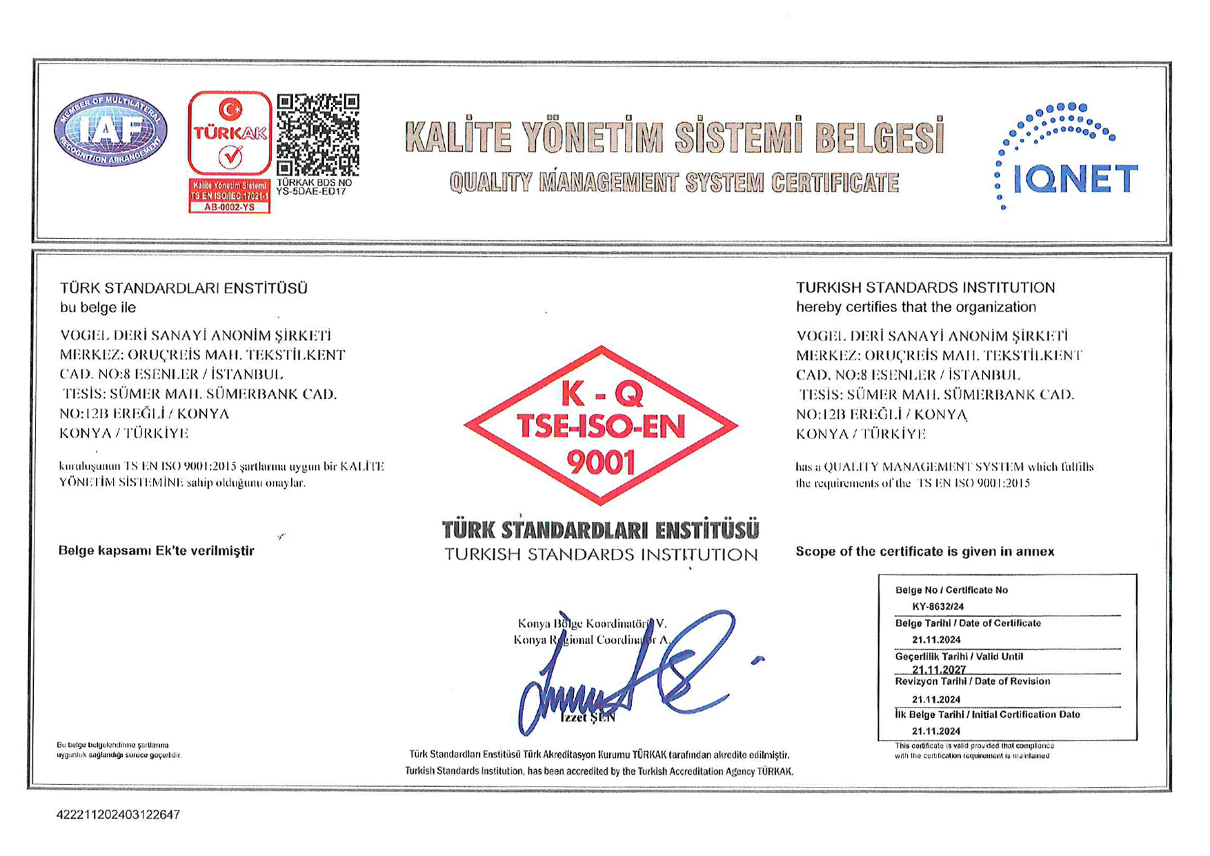 Vogel olarak kalitenin kusursuzluğu için her türlü teknolojik ve idari gelişimi takip edilmekte, konu hakkında ihtiyaç duyuacak tüm gereçlere sahip olmaktadır. Kalitede sürdürülebiliriğin sağlanması adına yetkili kurumlar tarafından gerçekleştirilen denetimlerle çalışmalarımız sürekli belgelendirilmektedir.