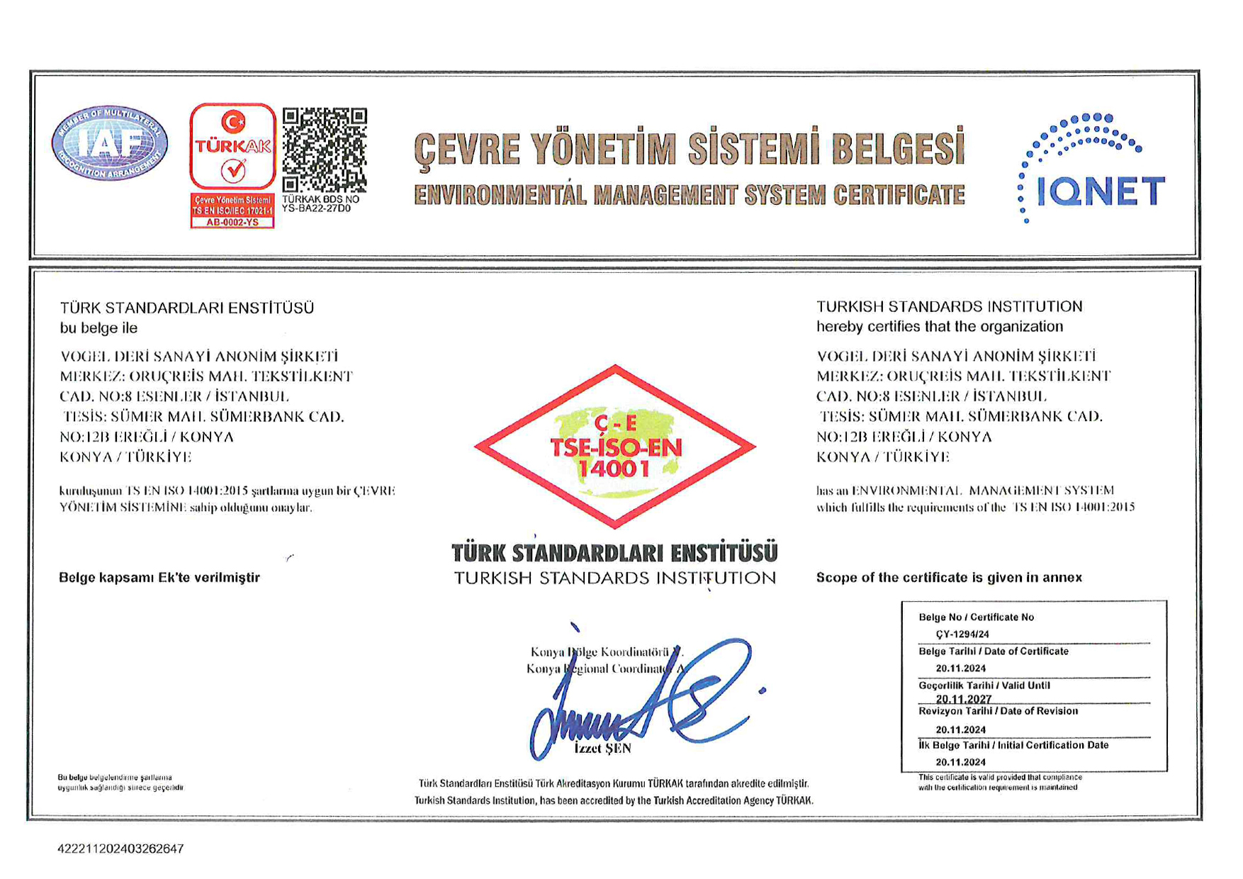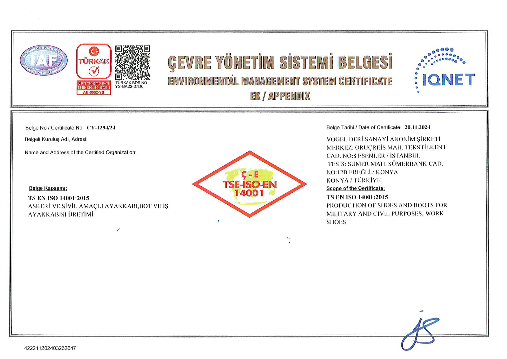 Vogel olarak sahip olduğumuz Ç-E TSE-ISO-EN-14001 - ÇEVRE YÖNETİM SİSTEMİ belgesiyle dünyamızın yaşam döngüsüne uygun doğaya zarar vermeyen ve üretim/ürün tasarımlarının çevreye en doğru şekilde kurgulandığı koşulları sağlıyoruz.