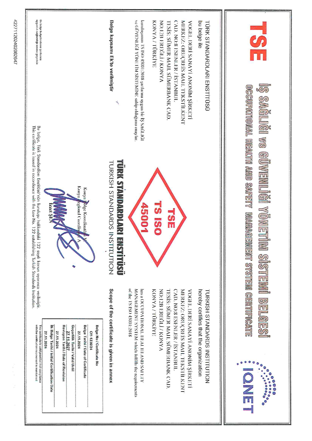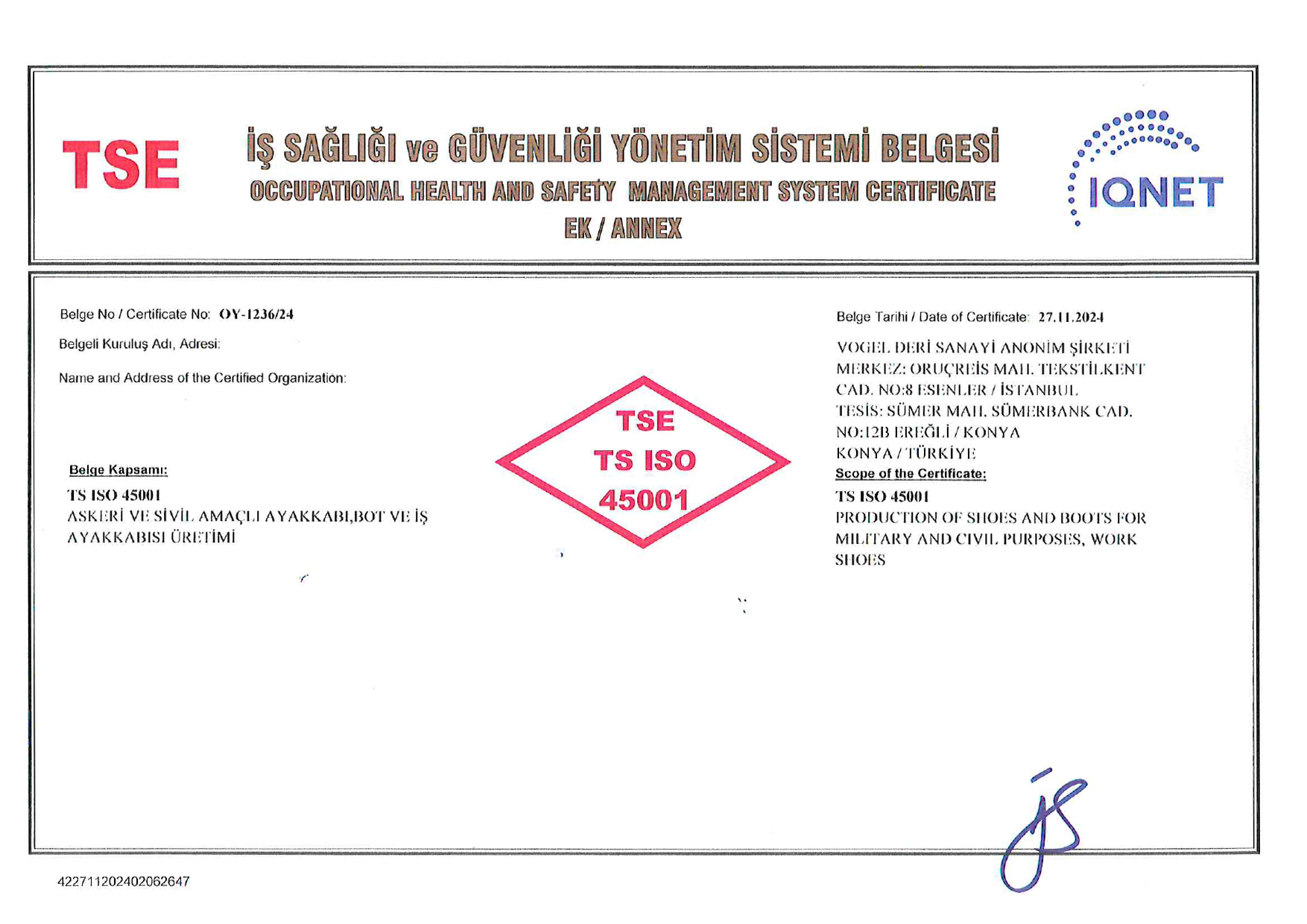 Bu kapsamda Vogel yalnızca çalışanlarının değil, tüm alanlarda önce insan ve insan sağlığı prensiplerini resmiyete dökmüş ve TS EN ISO 45001 İş Sağlığı ve Güvenliği Yönetim Sistemi belgelerini edinmiştir.
